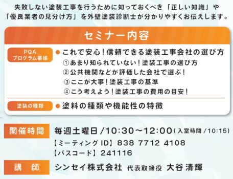 安心の塗装工事をするための【オンライン塗り替え勉強会】